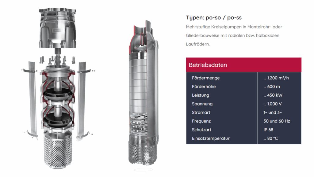 Diese Pumpen kommen vor allem bei der Wasserförderung aus großen Tiefen zum Einsatz – beispielsweise aus Brunnen, Schächten oder Bohrlöchern. Dank ihrer mehrstufigen Bauweise erzeugen sie hohe Förderdrücke und eignen sich besonders für die kommunale Wasserversorgung, Bewässerungssysteme in der Landwirtschaft sowie industrielle Anwendungen, bei denen eine zuverlässige und kraftvolle Förderung über lange Strecken erforderlich ist.